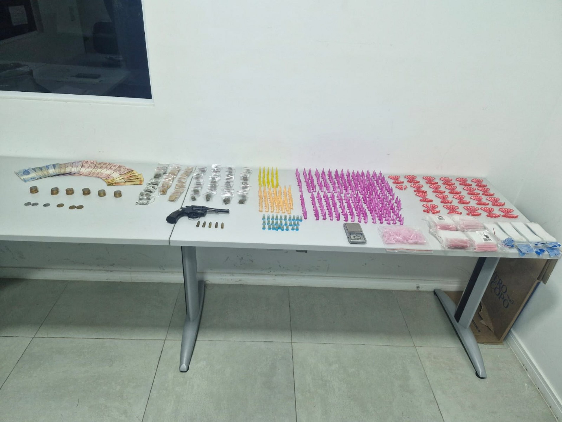 Um homem foi preso por tráfico de drogas e posse ilegal de arma de fogo na noite desta quinta-feira (30), no bairro Altos de Ipanema, em Sorocaba. Com ele foram apreendidos 628 pinos de cocaína, 51 porções de maconha, 28 pinos de crack e 19 porções de k9, 2 celulares, uma balança, embalagens, 5 munições do calibre 32 e 1 revólver carregado, além de R$ 282,00 em dinheiro.