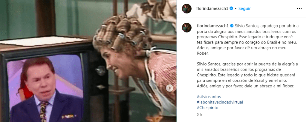 A atriz que interpretou Dona Florinda, Florinda Meza, publicou uma homenagem nas redes sociais ao Silvio Santos e pediu para o apresentador dar um abraço em Roberto Bolaños, que morreu em 2014, sendo o criador e ator que fez Chaves. Florinda era casada com Roberto, dividindo a vida pessoal e a profissional.