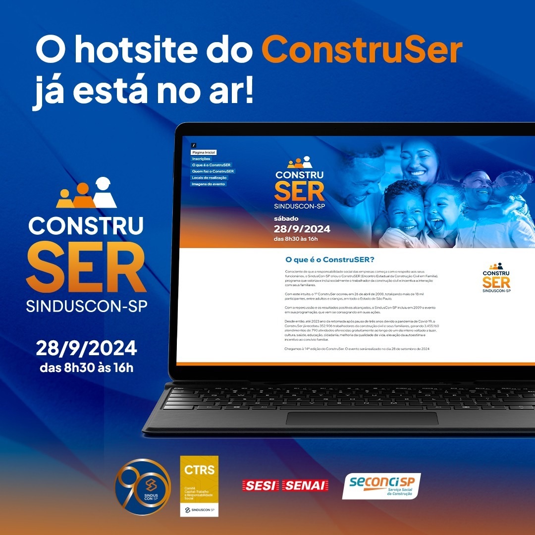 O SindusCon-SP, em parceria com o Sesi, Senai e Seconci-SP, realizará em 28 de setembro, das 8h30 às 16 horas, a 14ª Edição do Encontro Estadual da Construção Civil em Família (ConstruSer), O evento acontecerá simultaneamente em São Paulo (Osasco), Bauru, Campinas, Presidente Prudente, Ribeirão Preto, Santo André (Mauá), Santos, São José do Rio Preto, São José dos Campos (Mogi das Cruzes) e Sorocaba (Sesi/Votorantim).