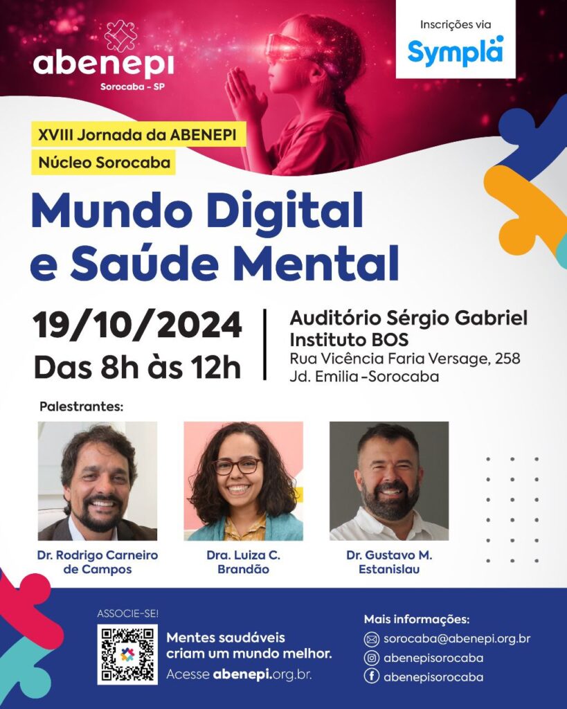 A Associação Brasileira de Neurologia, Psiquiatria Infantil e Profissões Afins (ABENEPI) – Núcleo Sorocaba, promove, no próximo sábado, dia 19, no Banco de Olhos de Sorocaba, o evento Mundo Digital e Saúde Mental.