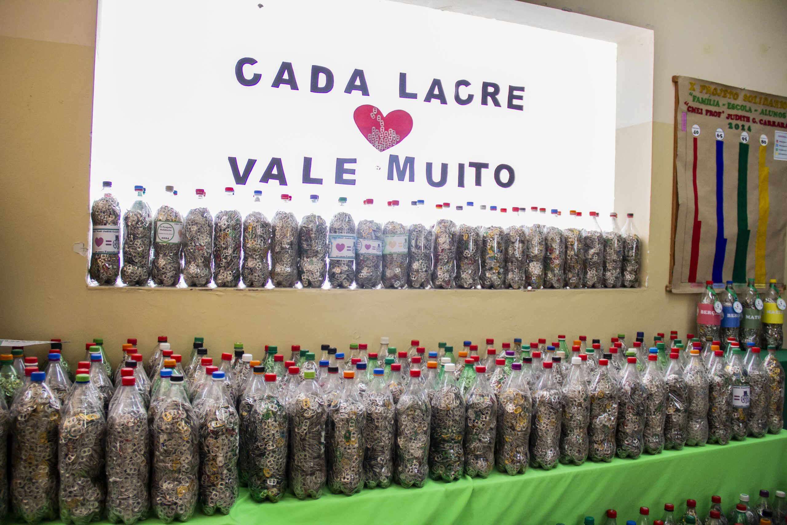 Neste ano, a instituição de ensino situada na Vila Nova arrecadou 280 garrafas PET de 2 litros cheias de lacres. Esse processo de recolhimento das peças de alumínio acontece graças a um trabalho constante de conscientização, que ultrapassa os limites físicos da creche, feito junto aos pais dos alunos e da comunidade.