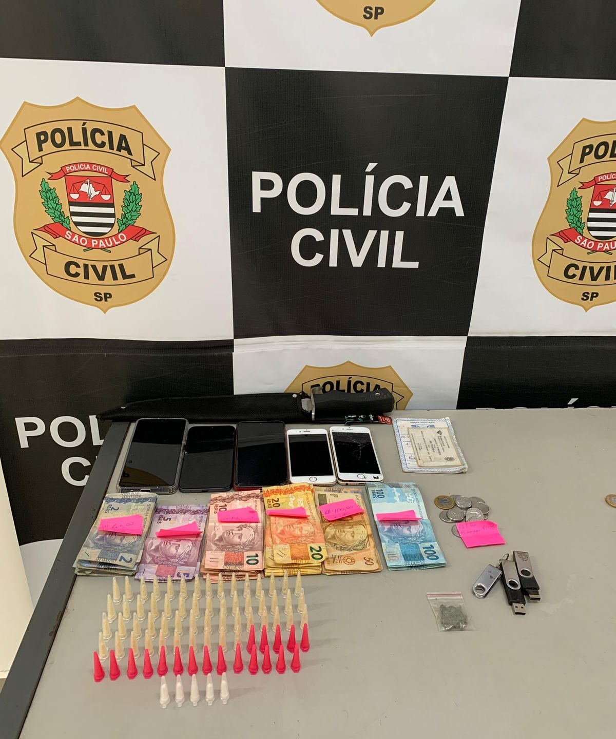 No segundo endereço, foram apreendidas cinco porções de cocaína, 74 de crack, R$ 1.400 em dinheiro, cinco aparelhos celulares, dois pen drives e um facão. No terceiro imóvel vistoriado, não foram encontrados materiais ilícitos.