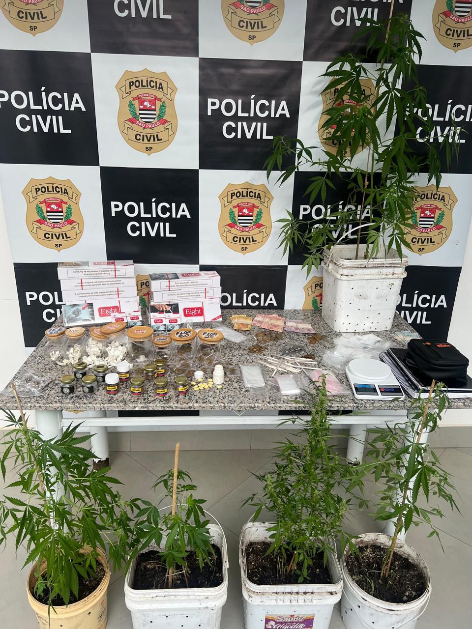 No interior do estabelecimento, próximo ao balcão de atendimento, os policiais localizaram diversas porções de maconha, comprimidos de ecstasy, embalagens vazias, balanças de precisão, R$ 327,25 em dinheiro e cadernos com anotações que possivelmente indicam a contabilidade do tráfico. Além disso, cigarros vindos do Paraguai, sem o devido pagamento dos tributos devidos, também foram encontrados. Na cozinha, mais porções de maconha estavam armazenadas, e nos fundos do imóvel, cinco pés de maconha cultivados em baldes foram localizados.