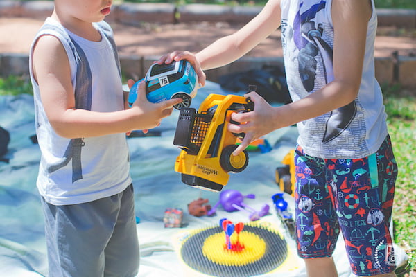 2. Exposição dos brinquedos: Traga uma toalha ou um pedaço de tecido TNT para expor os brinquedos no chão, criando um espaço organizado e convidativo.