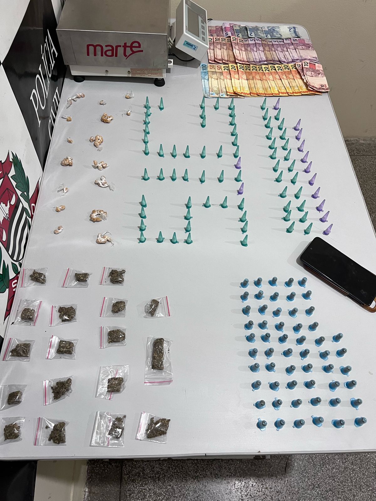Já na segunda ação, os policiais foram até o bairro Jardim Teixeira dos Santos após receberem denúncia sobre o comércio de drogas na região. No local, avistaram um indivíduo retirando embalagens de uma área com mato alto e entregando a pessoas que se aproximavam.