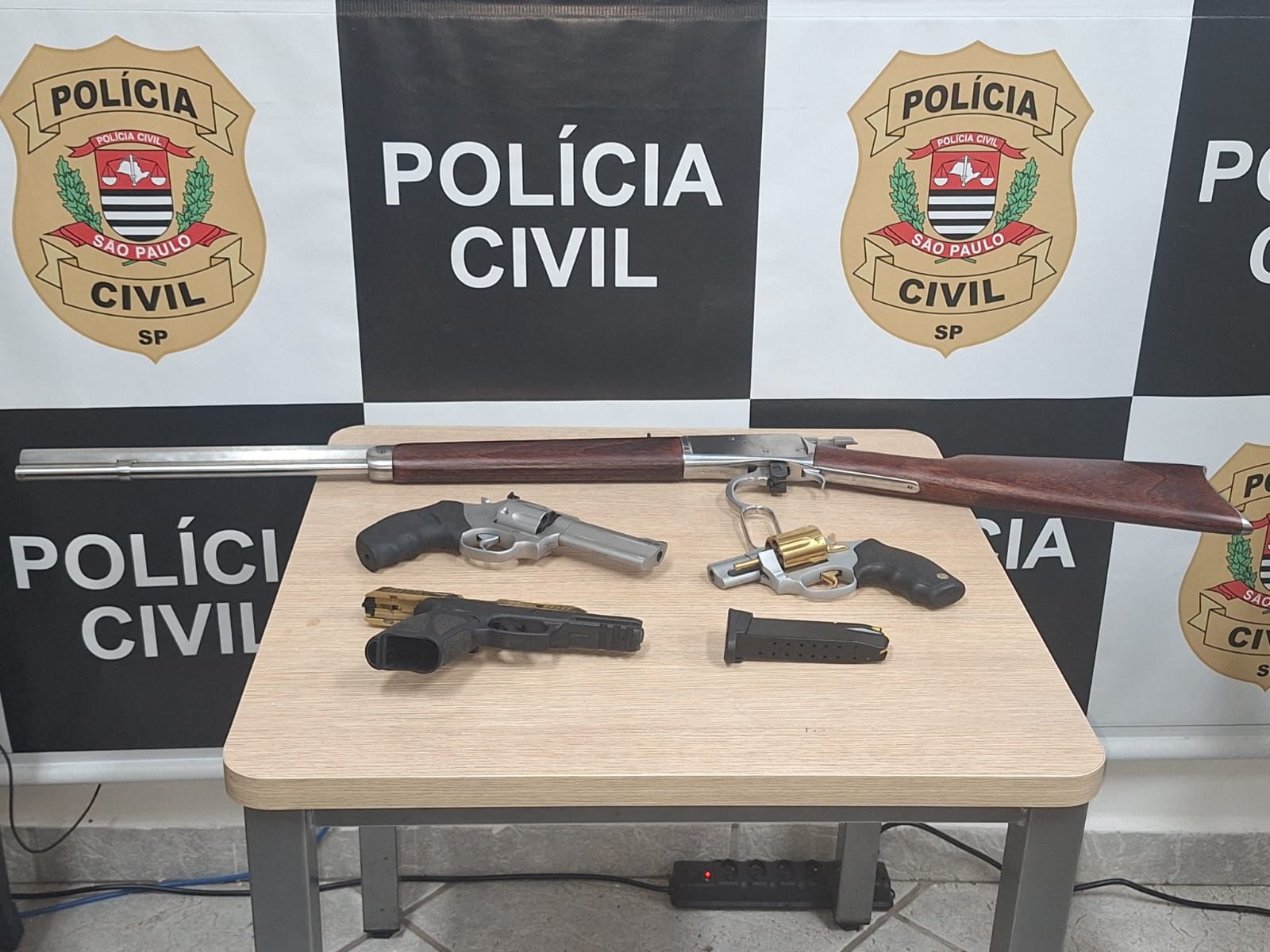 Durante a vistoria no imóvel, os policiais civis localizaram quatro armas de fogo: dois revólveres, uma pistola e uma carabina, além de um carregador de munições. Todo o armamento era de calibre permitido. O homem, de 44 anos, possui certificado de registro como colecionador, atirador e caçador (CAC), e apresentou a documentação das armas.