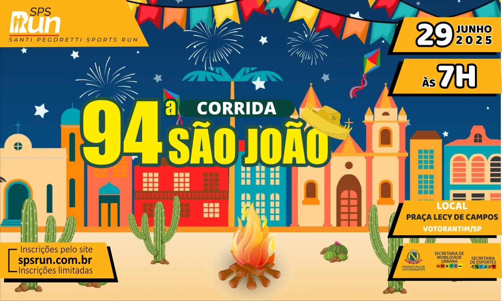 A 94ª Corrida de São João está com inscrições abertas. A tradicional competição realizada nas ruas de Votorantim acontecerá no dia 29 de junho, a partir das 7 horas, com largada na praça Lecy de Campos. As opções são corrida de 5 e 10 quilômetros, e caminhada de 3 quilômetros.