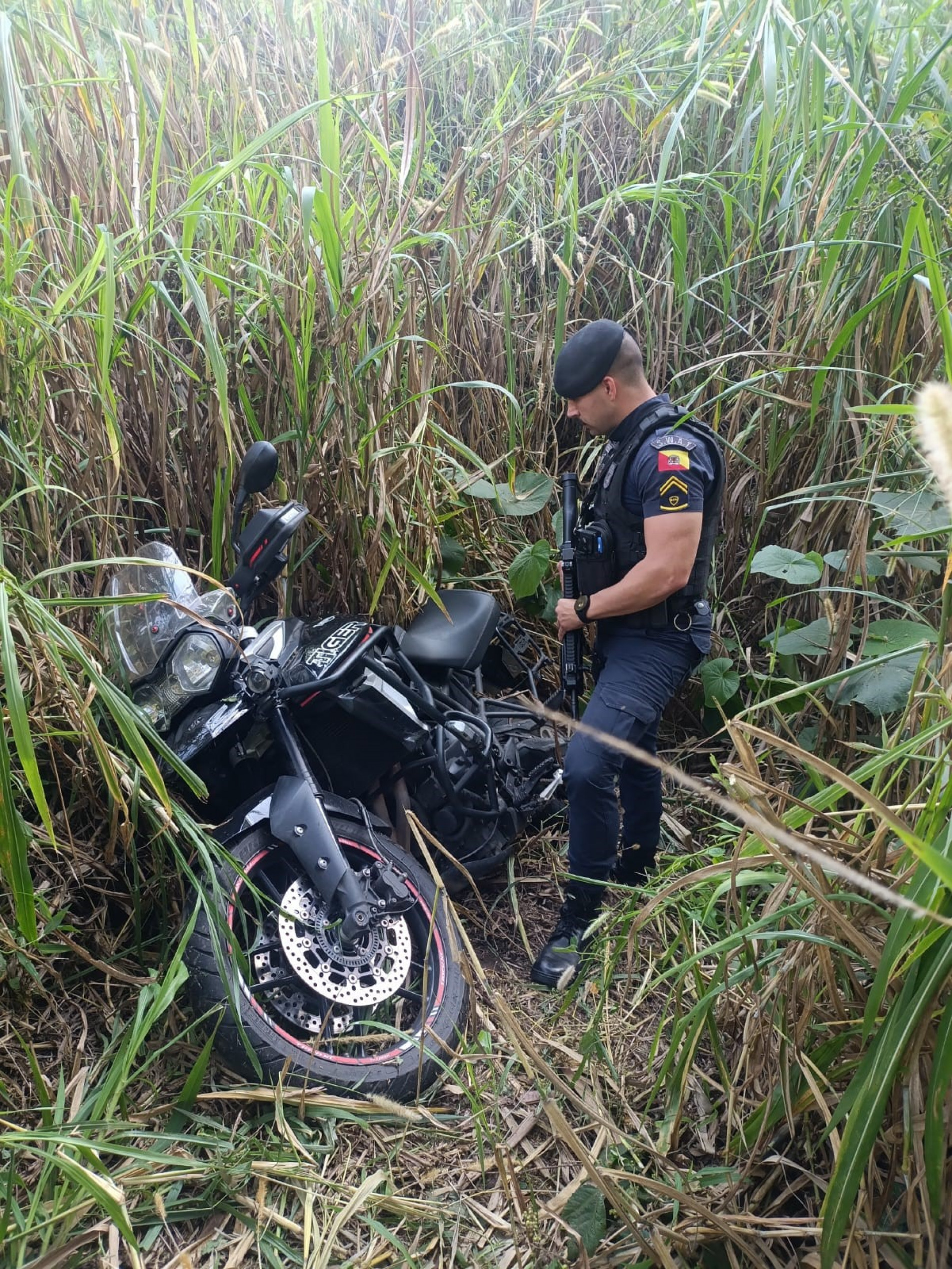 Durante patrulhamento preventivo pela região, por volta das 15h50, os guardas avistaram uma moto parcialmente encoberta pela vegetação, nos fundos da rua Avelino Elias, próximo a um campo de futebol. Após consulta ao sistema de segurança pública, foi constatado que se tratava de uma Triumph Tiger XR, de cor preta, furtada anteriormente.