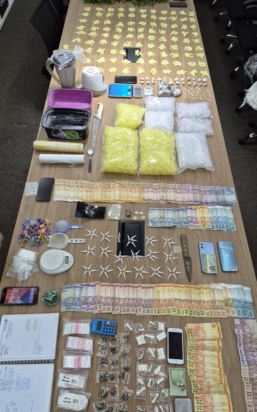 As equipes apreenderam 1.096 pinos de cocaína, 26 porções pequenas, uma porção grande e um tijolo de maconha, 25 porções de óleo de maconha e cinco pés de maconha in natura. Também foram encontrados 36 pedras pequenas e 24 médias de crack, cerca de 10 mil microtubos tipo eppendorf, cinco balanças de precisão, centenas de embalagens “zip lock” e utensílios utilizados no preparo das drogas, como liquidificador, peneiras e facas. Aproximadamente R$ 3 mil em dinheiro e sete celulares também foram recolhidos.