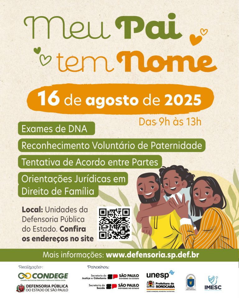 A Defensoria Pública do Estado de São Paulo, com apoio institucional da Prefeitura de Sorocaba, realizará, no dia 16 de agosto, das 9h às 13h, na Unidade da Defensoria Pública, um mutirão intitulado “Meu Pai Tem Nome” com uma série de serviços para assegurar o direito à paternidade registral e a direitos correlatos.