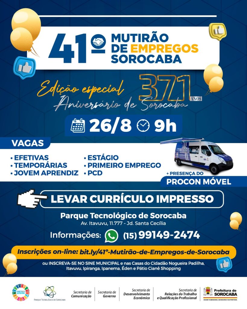 No próximo dia 26 de agosto, às 9h, no Parque Tecnológico de Sorocaba, acontece a 41ª edição do “Mutirão de Empregos Sorocaba”, desta vez, com o tema especial “Aniversário de Sorocaba”. No local, serão disponibilizadas diversas oportunidades de trabalho, vagas efetivas, temporárias, estágio, entre muitas outras.