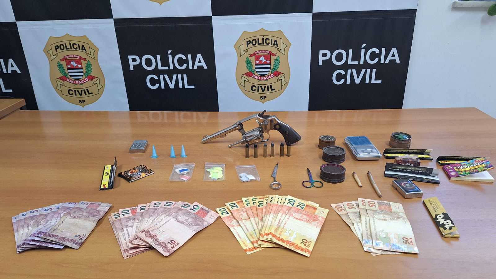 Durante a operação, os agentes localizaram um revólver calibre 38 com seis munições escondido no sofá da sala, além de três porções de cocaína, 17 pacotes de outro entorpecente, cinco cigarros de maconha, R$ 840 em dinheiro, uma balança de precisão, quatro dechavadores e dois isqueiros.
