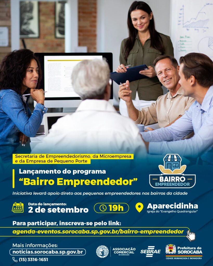 A Prefeitura de Sorocaba, por meio da Secretaria de Empreendedorismo, da Microempresa e da Empresa de Pequeno Porte (Semepp), em parceria com a Associação Comercial de Sorocaba (Acso) e do Sebrae Sorocaba, divulga nova data de lançamento do programa “Bairro Empreendedor”, iniciativa que levará apoio direto aos pequenos empreendedores, nos bairros da cidade. A inauguração do programa acontecerá no dia 2 de setembro (terça-feira), às 19h, na Igreja do “Evangelho Quadrangular” do bairro Aparecidinha.