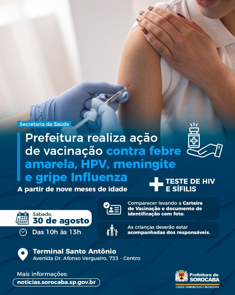 Com objetivo de ampliar a cobertura vacinal contra gripe influenza, a Prefeitura de Sorocaba, por meio da Secretaria da Saúde (SES), realizará, neste sábado (30), das 10h às 13h, uma ação de vacinação no Terminal Santo Antônio. No local, também haverá testagem de HIV e Sífilis.
