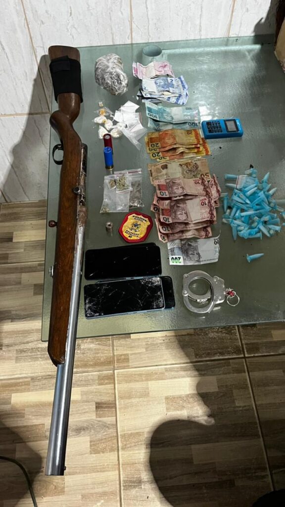 Durante as diligências na região, os policiais perceberam uma intensa movimentação de pessoas na residência, típica da atividade criminosa. Na abordagem, foram localizadas em um dos cômodos grande quantidade de drogas de diferentes tipos, entre elas cocaína, crack, maconha e comprimidos de ecstasy. Também foram apreendidos dinheiro, balanças de precisão, embalagens e uma espingarda calibre 12 artesanal, acompanhada de munições intactas.