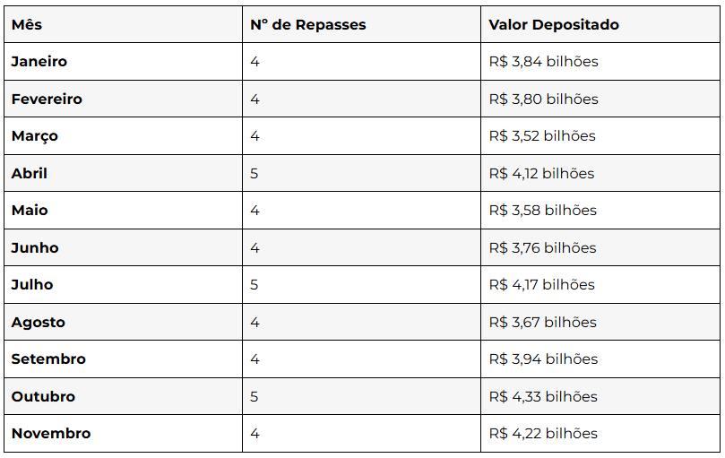 Antes desse depósito, as prefeituras haviam recebido R$ 2,82 bilhões em três repasses anteriores, feitos nos dias 11, 18 e 25 de novembro, referentes às arrecadações dos períodos de 3 a 7, 10 a 14 e 17 a 21 de novembro. Com isso, o total repassado aos municípios no mês chega a R$ 4,22 bilhões.