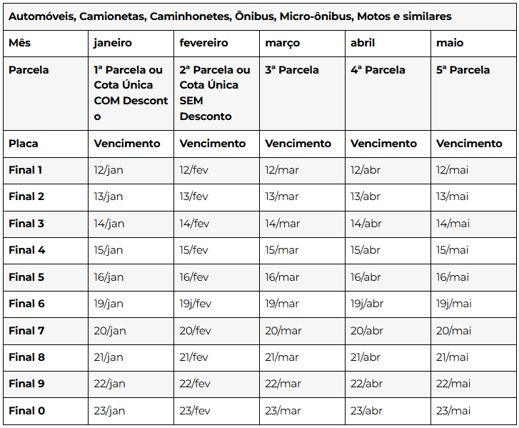 O pagamento segue o final da placa do veículo e pode ser feito à vista, com desconto de 3%, ou parcelado em até 5 vezes, de acordo com o valor do imposto devido.