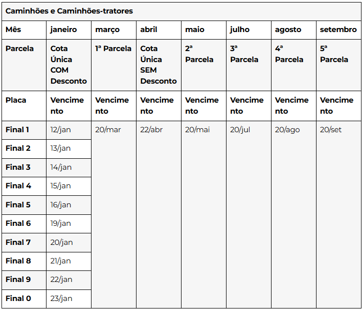 A tabela de pagamento para proprietários de veículos de carga é diferente. O pagamento pode ser feito, sem desconto, até 22 de abril, ou parcelado em até cinco vezes, com data fixada no dia 20 de cada mês.