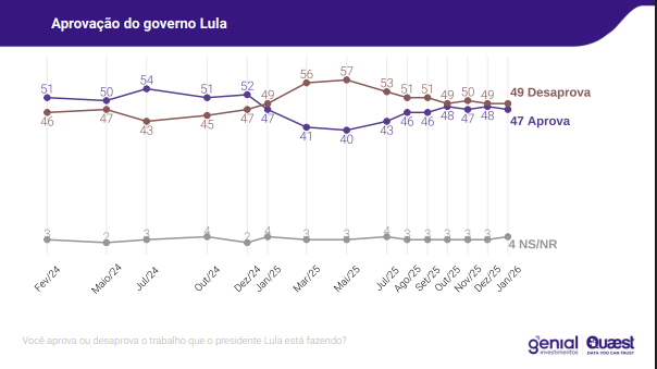 O levantamento aponta que 49% dos brasileiros desaprovam a atual gestão, enquanto 47% a aprovam. Embora o cenário esteja tecnicamente empatado, a rejeição apresenta vantagem numérica.