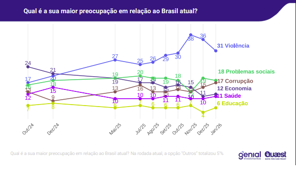 Além da avaliação do governo, a pesquisa também identificou as principais preocupações dos brasileiros. A violência lidera os motivos de apreensão, citada por 31% dos entrevistados, seguida por problemas sociais (18%) e corrupção (17%). Questões econômicas, como inflação e custo de vida, foram mencionadas por 12% dos participantes.