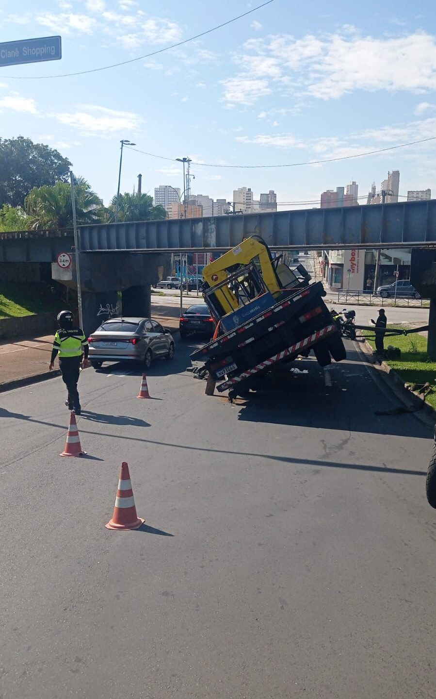 Segundo informações apuradas no local, o motorista seguia pela Rua Mascarenhas Camelo e tentou acessar a Rua Padre Luiz quando o veículo, que excedia o limite de altura permitido, acabou enroscando na estrutura do viaduto.