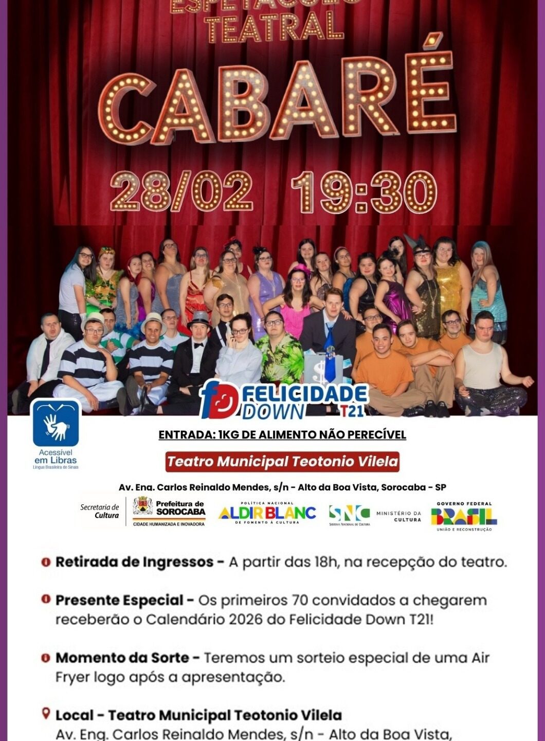 O espetáculo teatral Cabaré será apresentado em Sorocaba, no sábado 28/02, às 19h30 no Teatro Municipal Teotônio Vilela, localizado na Av. Eng. Carlos Reinaldo Mendes, s/n – Alto da Boa Vista, em Sorocaba. A apresentação é gratuita.
