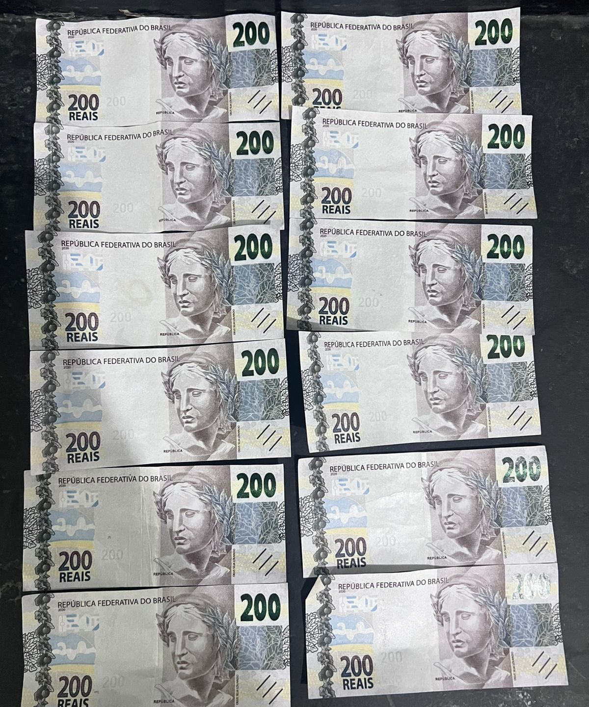 Com ele, foram apreendidas duas notas falsas de R$ 200, R$ 320 em dinheiro verdadeiro, um celular e diversos produtos adquiridos com as cédulas falsificadas. Além disso, vítimas compareceram à delegacia e entregaram, ao todo, dez notas falsas de R$ 200 recebidas no comércio local.