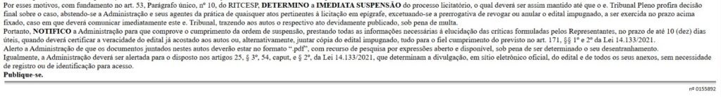 Diante dos indícios, o Tribunal determinou a suspensão do pregão até que o caso seja analisado pelo plenário da Corte. A Prefeitura foi notificada e terá até 10 dias úteis para prestar esclarecimentos e comprovar o cumprimento da decisão.