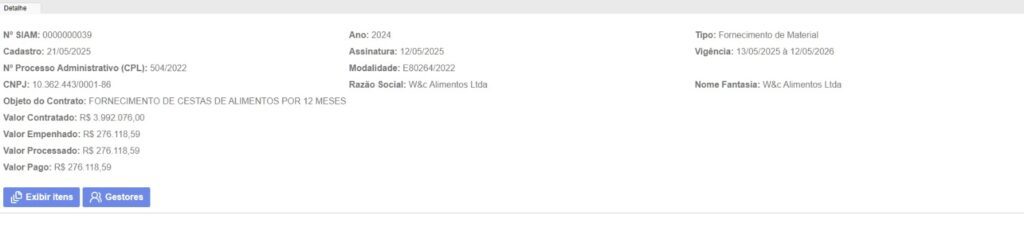 Já em Sorocaba, há registro de contrato para fornecimento de cestas de alimentos por 12 meses, com valor global superior a R$ 3 milhões e 990 mil.