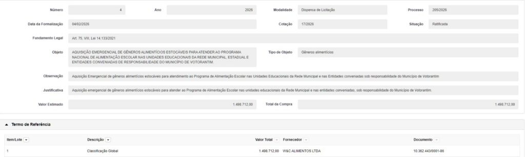 Em Votorantim, a empresa consta como fornecedora em dispensa de licitação formalizada em fevereiro de 2026 para aquisição emergencial de gêneros alimentícios destinados ao Programa Nacional de Alimentação Escolar, no valor aproximado de R$ 1 milhão e 498 mil.