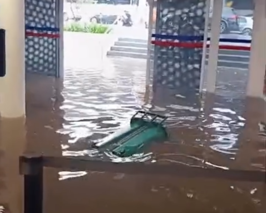 Imagens registradas no interior do prédio mostram funcionários caminhando em meio à água acumulada no saguão de entrada, que em alguns pontos chegou à altura do joelho.