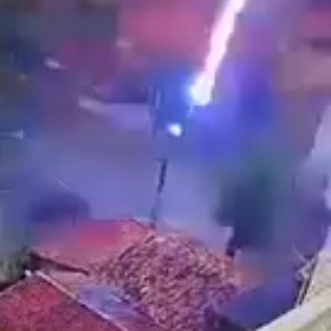 Imagens de uma câmera de segurança registraram o momento em que a descarga elétrica atinge o imóvel, provocando um forte clarão e um barulho que assustou moradores da região.