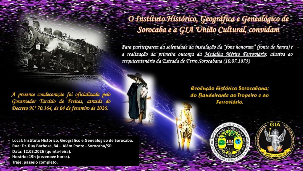 O Instituto Histórico, Geográfico e Genealógico de Sorocaba (IHGGS), em conjunto com o GIA – União Cultural, realiza nesta quinta-feira (12), a solenidade de instalação da “Fons Honorum” (Fonte de Honra) e a cerimônia de outorga da Medalha do Mérito Ferroviário alusiva ao Sesquicentenário da Estrada de Ferro Sorocabana.