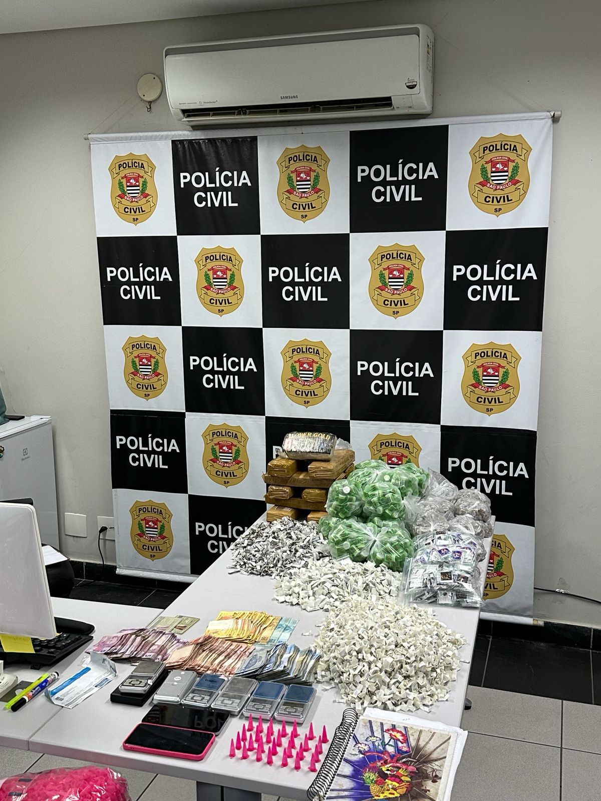 Além das drogas, também foram encontrados milhares de microtubos e embalagens plásticas utilizadas para o preparo e individualização das porções, balanças de precisão, telefones celulares, um caderno com anotações relacionadas à contabilidade do tráfico, R$ 1.633 em dinheiro e dois veículos.
