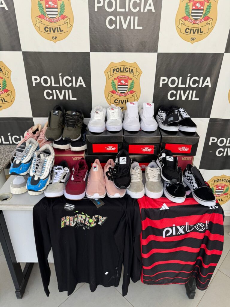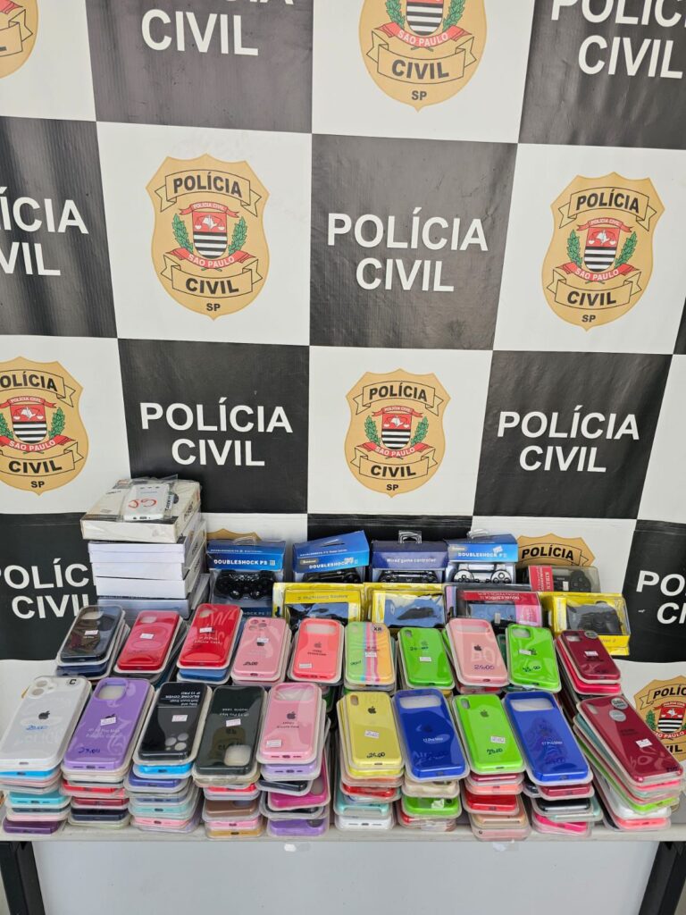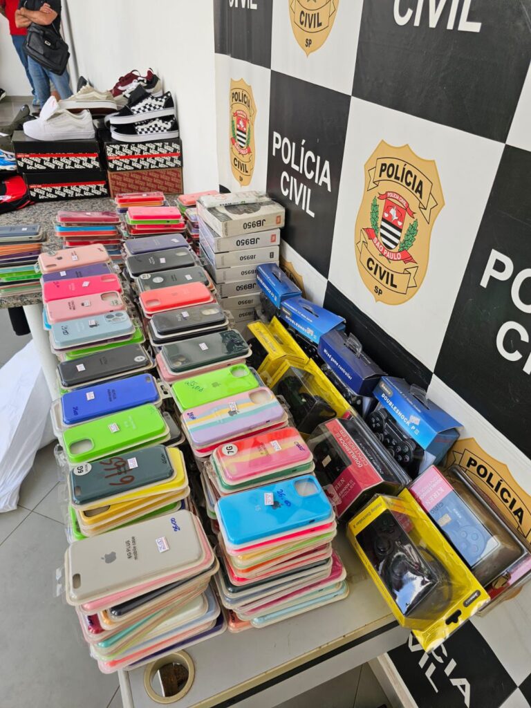 Durante a operação, os policiais civis apreenderam diversos itens, entre eles capinhas de celular, tênis, bonés, fones de ouvido, camisetas de times de futebol e consoles de videogame, além de outros produtos e acessórios. Todo o material recolhido será encaminhado para perícia técnica, a fim de confirmar a eventual falsificação.