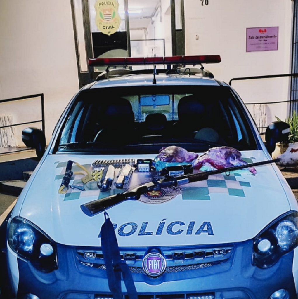Na ação, os policiais apreenderam uma arma de fogo, munições, equipamentos utilizados na caça e cerca de 4,3 quilos de carne de animal silvestre.