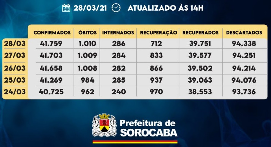 A Prefeitura de Sorocaba, por meio da Secretaria da Saúde (SES), registrou a notificação de mais 56 casos confirmados da Covid-19, neste domingo (28). Com isso, os casos confirmados com a doença passaram de 41.703 para 41.759 na cidade. Do total de confirmados, 286 estão internados (152 em UTI) e o total de pessoas em […]