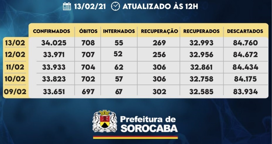 A Prefeitura de Sorocaba, por meio da Secretaria da Saúde (SES), registrou mais 54 casos confirmados da COVID-19, com 37 recuperados, de acordo com o levantamento divulgado neste sábado (13). Com isso, os casos confirmados da doença chegaram a 34.025 na cidade, sendo quo o número de recuperados é de 32.993. Também foi registrada uma […]