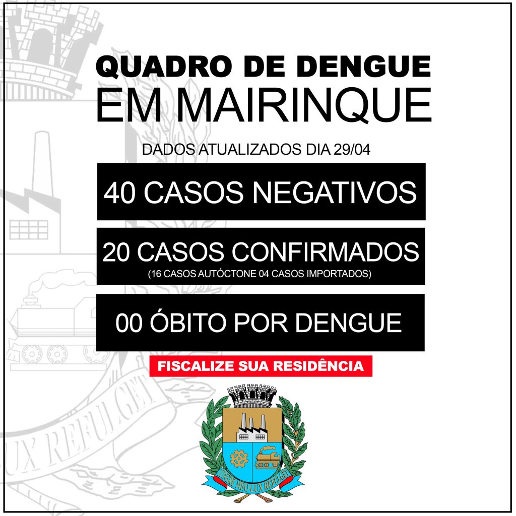 A Secretaria de Saúde da Prefeitura de Mairinque alerta a população sobre novos casos de Dengue no município, que nesta semana já contabilizam 20 confirmações. Nestes primeiros quatro meses do ano, foram 63 notificações, com 40 negativos e três suspeitos aguardando resultados. De acordo com o levantamento mais recente da Vigilância Epidemiológica são 4 casos […]