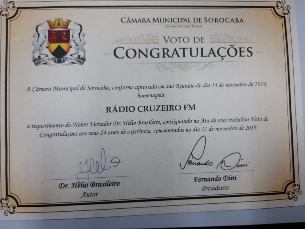 A requerimento do vereador Hélio Brasileiro (MDB), a Câmara de Sorocaba enviou Votos de Congratulações aos 24 anos de existência da rádio Cruzeiro FM. A data foi comemorada no dia 11 de Novembro de 2019.