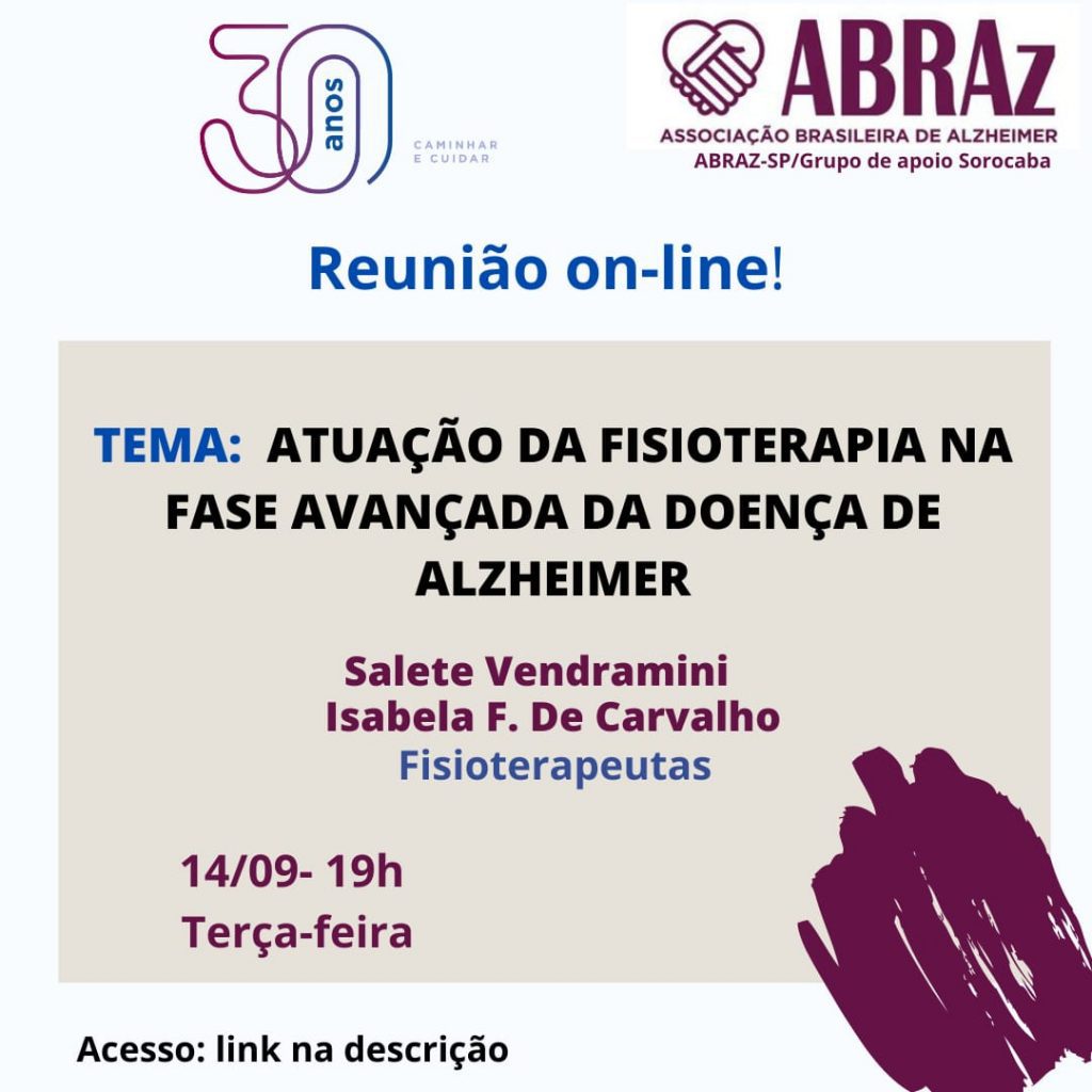A Associação Brasileira de Alzheimer (Abraz) realiza nesta terça-feira (14), às 19h, mais uma palestra on-line para o público de Sorocaba. O tema desta vez é a ” Atuação da Fisioterapia na fase avançada da Doença de Alzheimer” com as palestrantes, que são fisioterapeutas, Salete AP. Vendramini e Isabela F. de Carvalho. Ouça os detalhes […]