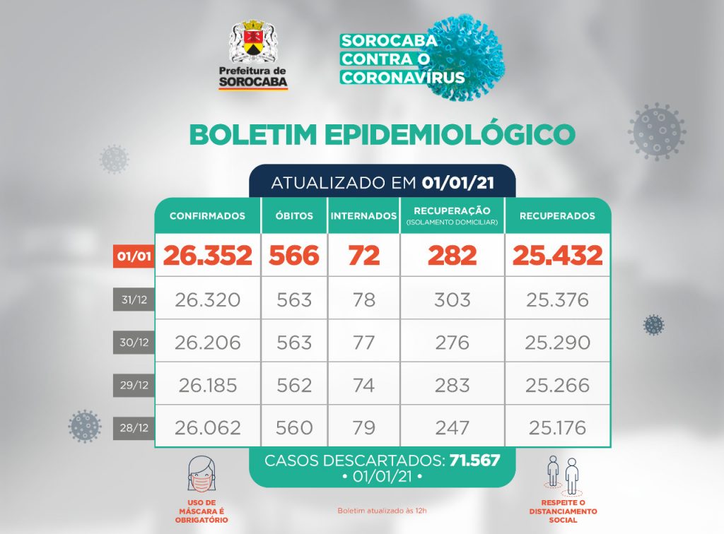 Sorocaba recebeu a notificação de mais 32 novos casos confirmados da Covid-19 neste primeiro dia de 2021, totalizando 26.352 casos desde o começo da pandemia. Entre os confirmados, 72 estão internados (26 em UTI) e o total de pessoas em recuperação (isolamento domiciliar) é 282. O número de recuperados é de 25.432, com 56 curados […]