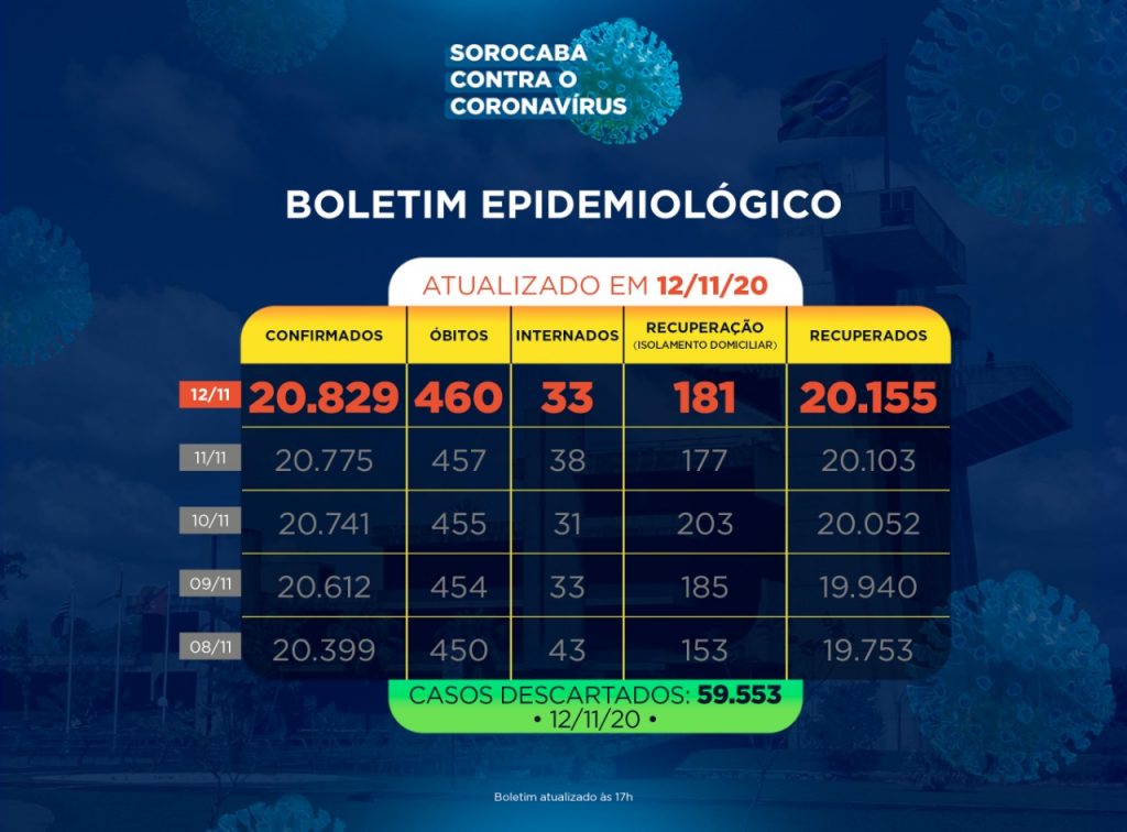 A Prefeitura de Sorocaba, por meio da Secretaria da Saúde (SES), registrou 20.155 recuperados da Covid-19, nesta quinta-feira (12). Já os casos confirmados com a doença passaram de 20.775 para 20.829 na cidade. Os óbitos com a confirmação da doença aumentaram para 460. Sorocaba recebeu a notificação de mais 54 novos casos confirmados da Covid-19 […]