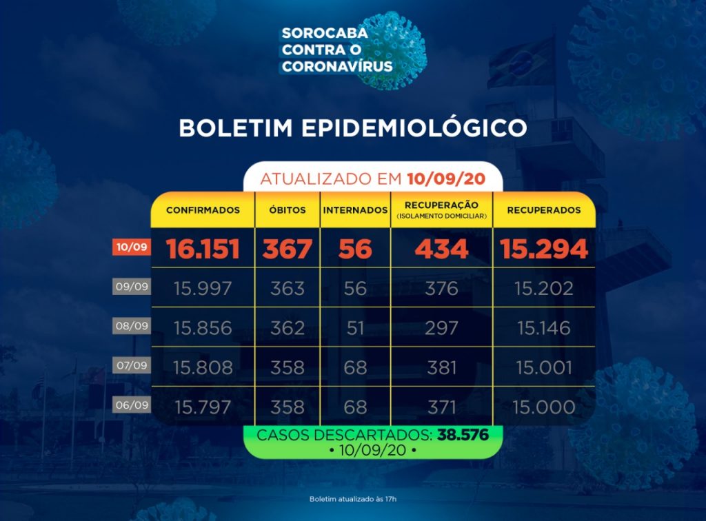 A Prefeitura de Sorocaba, por meio da Secretaria da Saúde (SES), registrou 15.294 recuperados da Covid-19, nesta quinta-feira (10). Já os casos confirmados com a doença passaram de 15.997 para 16.151 na cidade. Os óbitos com a confirmação da doença aumentaram para 367. Sorocaba recebeu a notificação de mais 154 novos casos confirmados da Covid-19 […]