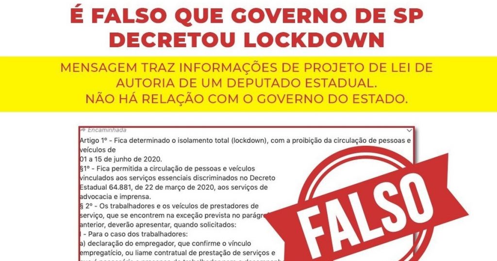 A assessoria de comunicação do Governo do Estado de São Paulo divulgou no início da tarde desta quinta-feira (21) que é falsa uma mensagem que circula por redes sociais e grupos de WhatsApp de que o governo paulista decretou lockdown para todo estado. Segundo a nota, o texto faz referência à proposta de emenda de um […]