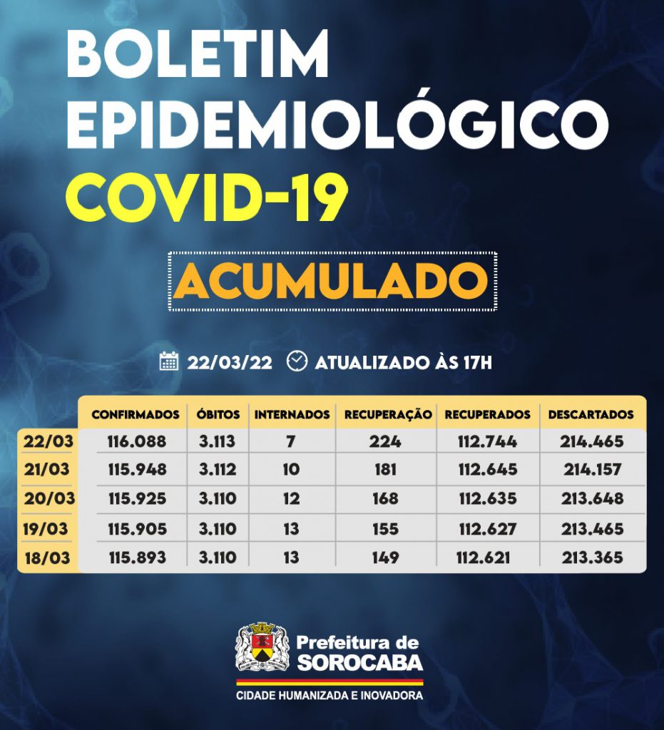 A Prefeitura de Sorocaba, por meio da Secretaria da Saúde (SES), registrou aumento do número de recuperados da Covid-19 nesta terça-feira (22), chegando ao total de 112.744. Já, os casos confirmados com a doença passaram de 115.948 para 116.088 na cidade. Os óbitos confirmados aumentaram para 3.113. A taxa de letalidade no município é de […]