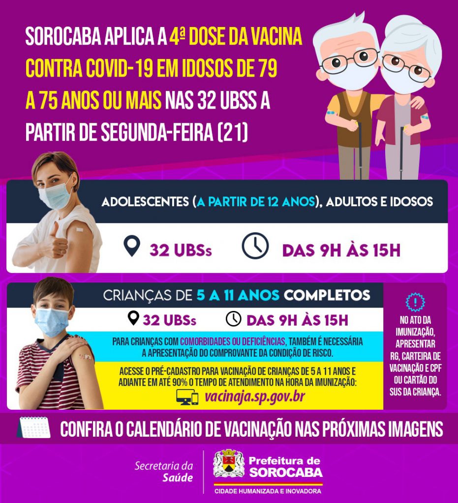 A Prefeitura de Sorocaba, por meio da Secretaria da Saúde (SES), aplicará, a partir de segunda-feira (21), a 4ª dose da vacina contra a Covid-19 em idosos de 79 a 75 anos ou mais (com intervalo mínimo necessário entre as doses de quatro meses), em 32 UBSs (Unidades Básicas de Saúde) da cidade, sempre das […]