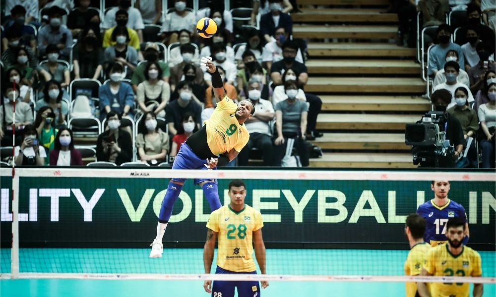 Na manhã desta quinta-feira(07), a seleção masculina de vôlei conseguiu mais uma vitória na Liga das Nações ao vencer o Canadá com parciais de 25-18, 25-19 e 25-16. Confira detalhes do confronto na reportagem de Nilson Duarte. Foto reprodução FIVB