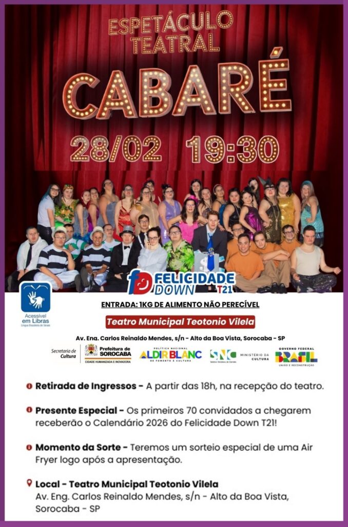 O espetáculo teatral Cabaré será apresentado em Sorocaba, no sábado 28/02, às 19h30 no Teatro Municipal Teotônio Vilela, localizado na Av. Eng. Carlos Reinaldo Mendes, s/n – Alto da Boa Vista, em Sorocaba. A apresentação é gratuita. O elenco do espetáculo é formado por atores com Síndrome de Down T21 que fazem parte da comunidade […]