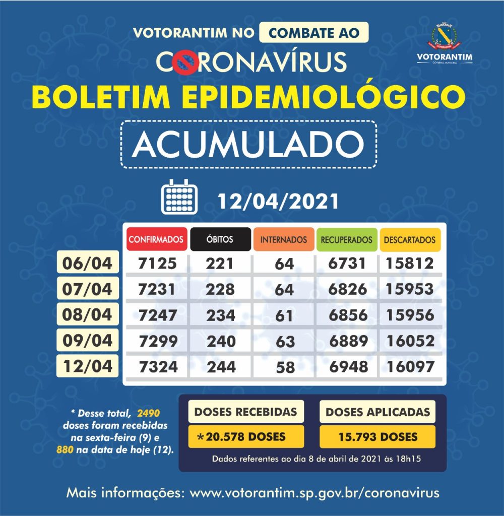 A Prefeitura de Votorantim, por meio da Secretaria de Saúde, registrou nesta segunda-feira (12) quatro mortes por Covid-19. Também foram confirmados 25 novos casos da doença. Entre as quatro mortes, três foram de mulheres com comorbidades. As vítimas tinham 55 anos (óbito em 11 de abril de 2021), 65 anos (óbito em 9 de abril […]